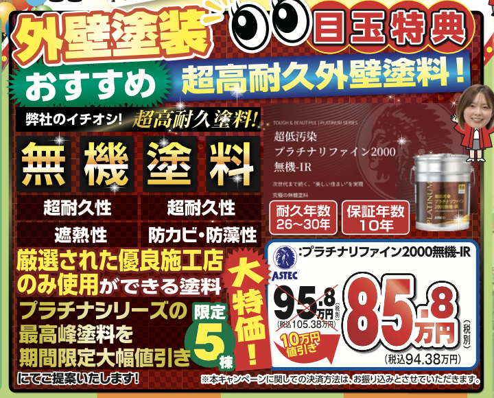 〈外壁塗装目玉特典〉無機塗料が大特価!限定5棟