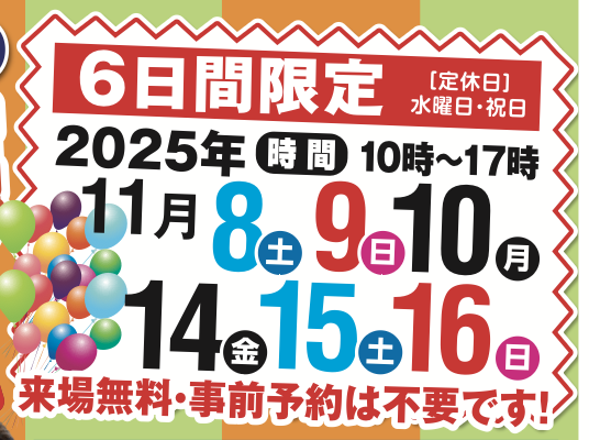 - 〈開催日程〉11/8(土),9(日),10(月),14(金),15(土),16(日)