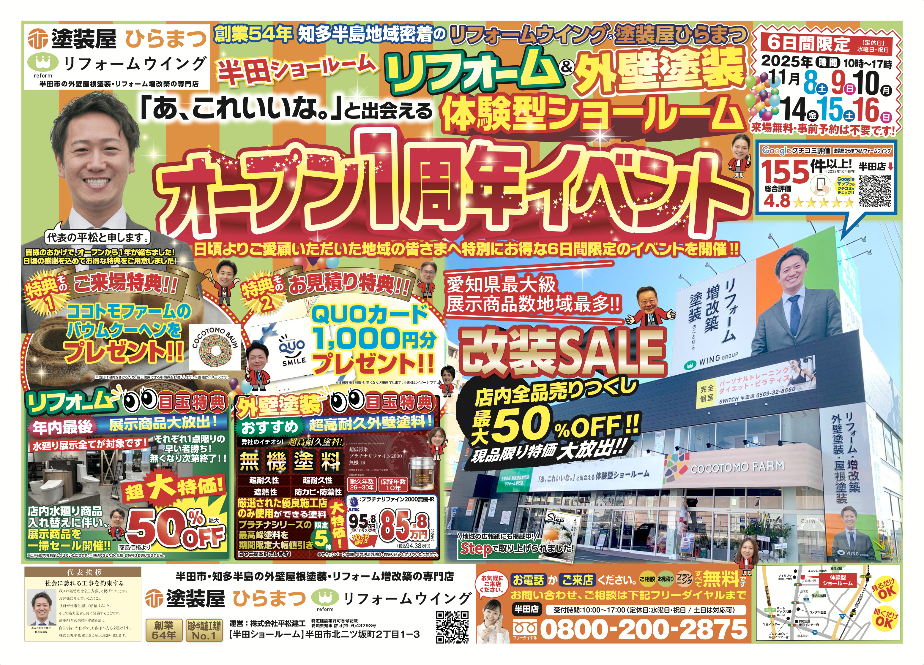 - 〈開催日程〉11/8(土),9(日),10(月),14(金),15(土),16(日) 10:00〜17:00 (会場:リフォームウイング 半田ショールーム) 詳しくはこちら >