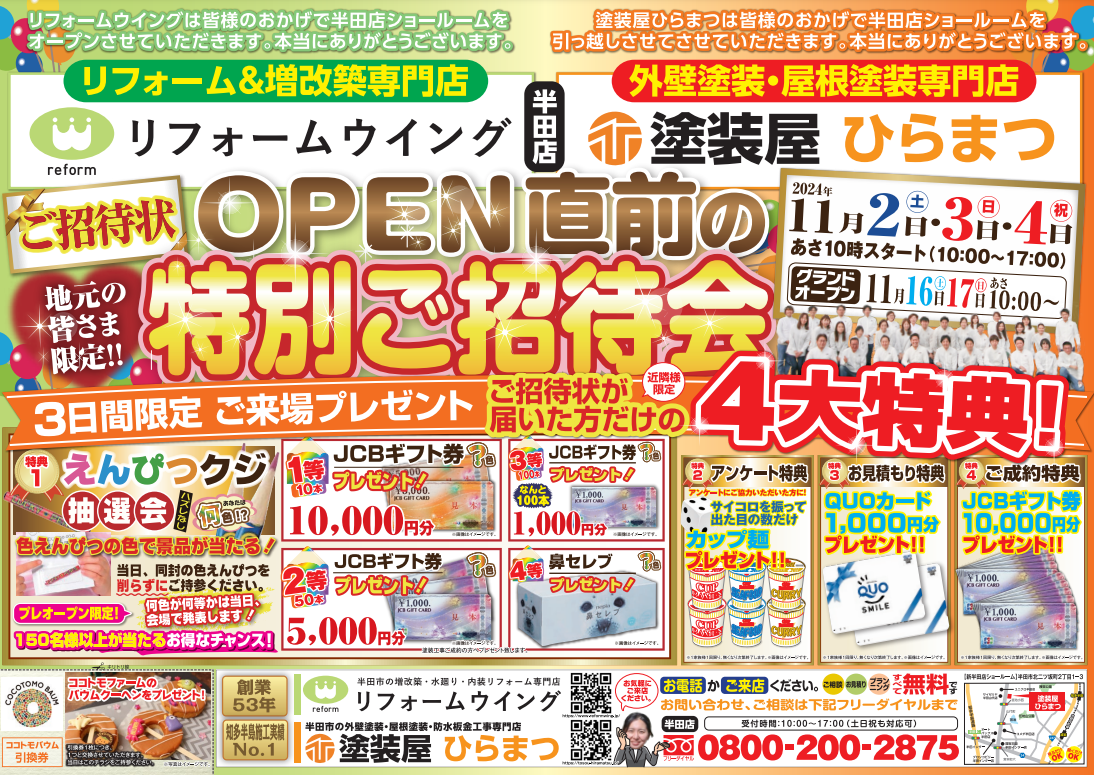 愛知最大規模のリフォーム・塗装ショールームとして新店舗がオープンにあたり、豪華特典をご用意しております✨