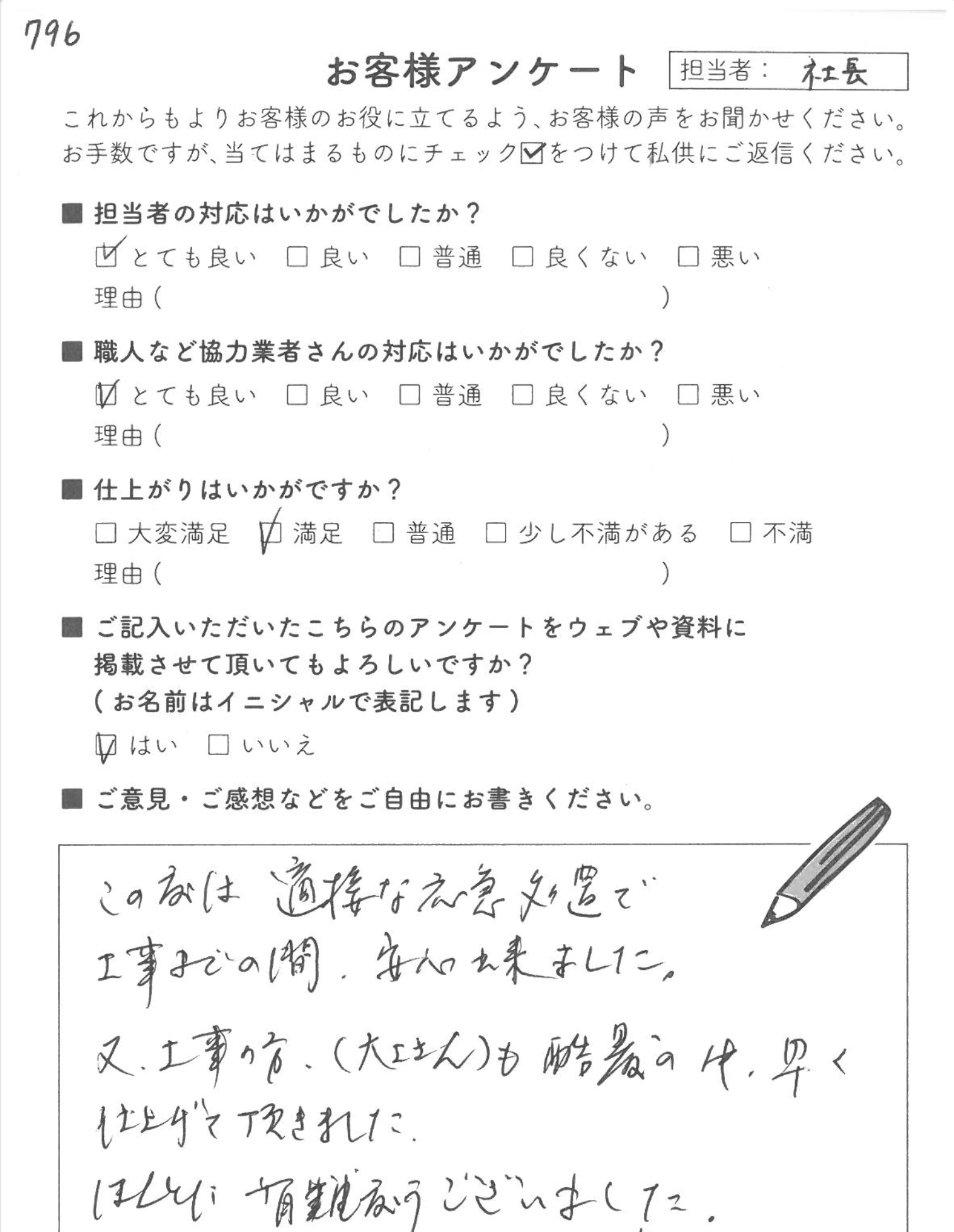 知多市 S様邸|2階天井補修 2階天井補修 担当者の対応はいかがでしたか? とても良い 職人など協力業者さんの対応はいかがでしたか? とても良い 仕上がりはいかがですか? 満足 ご意見・ご感想などをご自由にお書きください。 この度は、適切な応急処置で工事までの間、安心できました。 また工事の方(大工さん)も酷暑の中、早く仕上げていただきました。 ほんとにありがとうございました。 担当 営業担当:平松利彦 前の記事 次の記事 一覧へ戻る