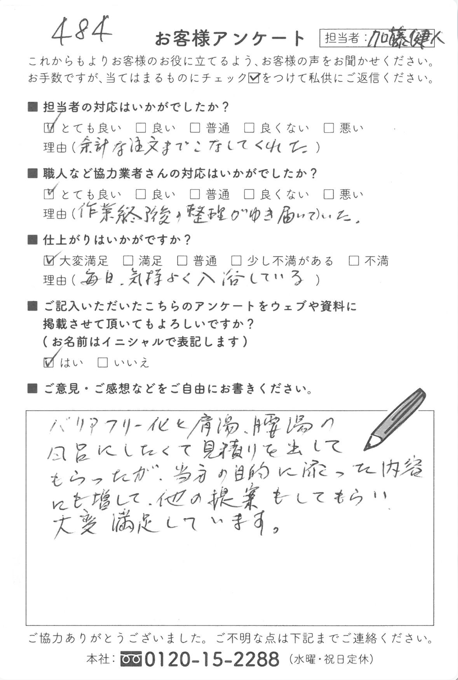 半田市S様邸|水廻りリフォーム 水廻りリフォーム 担当者の対応はいかがでしたか? とても良い 理由:余計な注文までこなしてくれた 職人など協力業者さんの対応はいかがでしたか? とても良い 理由:作業終了後の整理が行き届いていた 仕上がりはいかがですか? 大変満足 理由:毎日、気持ちよく入浴している ご意見・ご感想などをご自由にお書きください。 バリアフリー化と肩湯、腰湯の風呂にしたくて見積もりを出してもらったが、当分の目的に沿った内容にも増して、他の提案もしてもらい、大変満足しています。 担当 営業担当:加藤健人 前の記事 一覧へ戻る