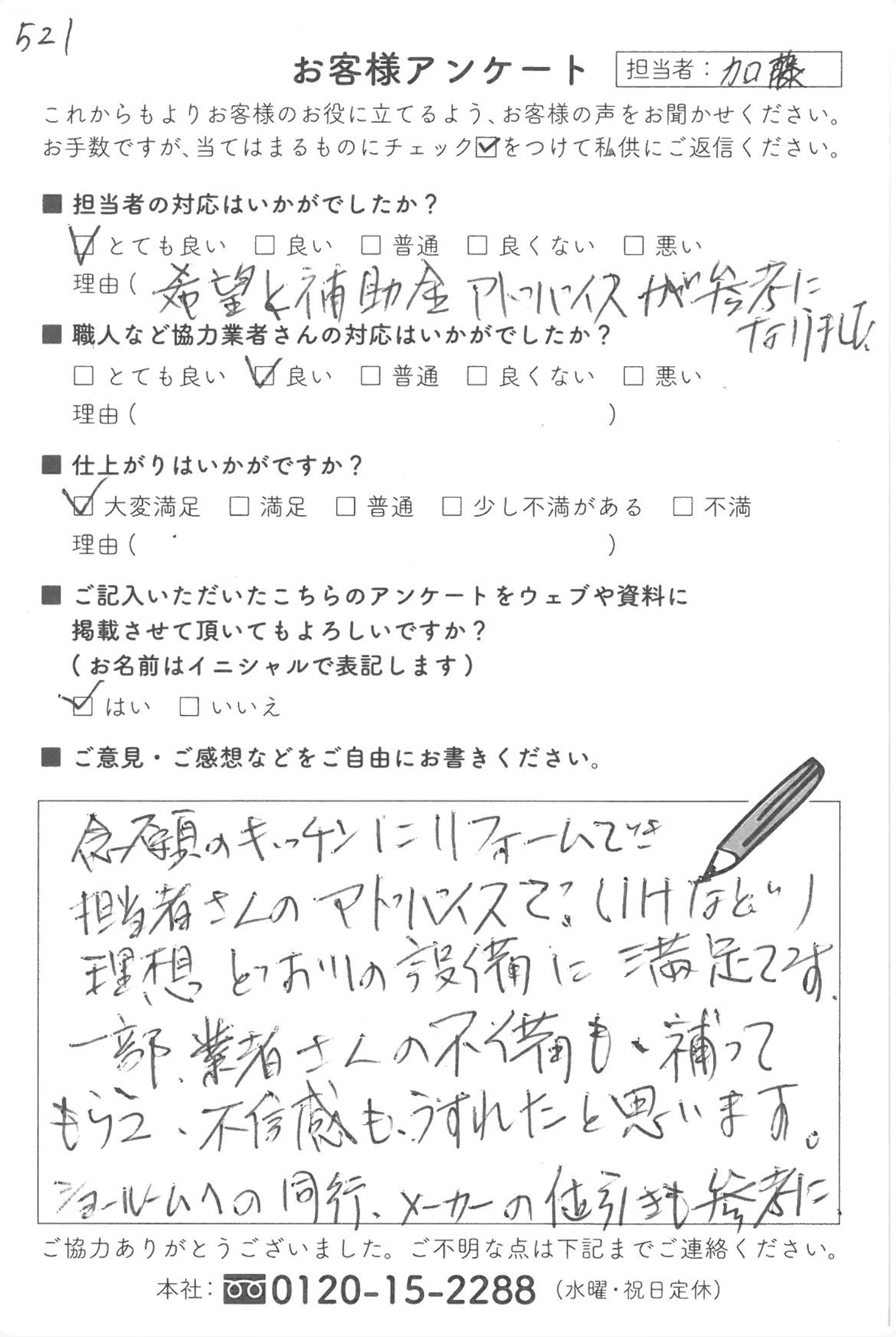 【南知多町】キッチンリフォーム キッチンリフォーム 担当者の対応はいかがでしたか? とても良い 理由:希望と補助金アドバイスが参考になりました。 職人など協力業者さんの対応はいかがでしたか? 良い 仕上がりはいかがですか? 大変満足 ご意見・ご感想などをご自由にお書きください。 念願のキッチンにリフォームでき、担当者さんのアドバイスで(IHなど)、理想どおりの設備に満足です。 一部、業者さんの不備も補ってもらえ、不信感も薄れたと思います。 ショールームへの同行、メーカーの値引きも参考に。 加藤 健人 担当ブログ プロフィール 担当事例 東海市出身です。誠心誠意対応させていただきます!お困りごとがございましたら、何でもご相談ください!頑張ります! 前の記事 一覧へ戻る