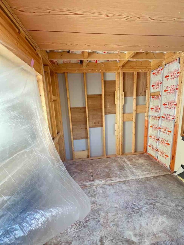 和室は、畳処分・押入撤去・建具撤去などの解体撤去からスタートし、壁下地組み、天井増張り、床下地組みまで下地から丁寧に作り直す内容をご提案しました。断熱材や下地材まで含めて整えることで、仕上がりの美しさだけでなく、安心して長く使える内装にしています。さらに「デコマド」などの意匠要素も取り入れ、空間のアクセントと抜け感をプラスするプランとしました。