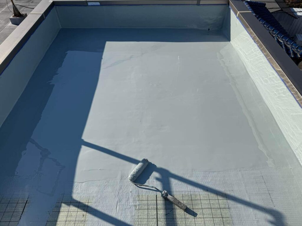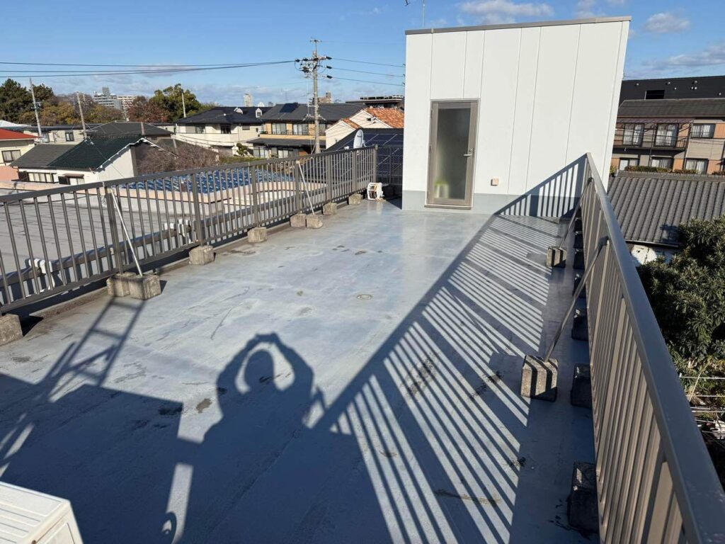 「クロス補強」による弱点箇所の強化: 漏水リスクが高い立上り部分や手摺の架台には、専用のクロスを入れて防水層を補強し、建物の揺れにも強い構造に仕上げました 。