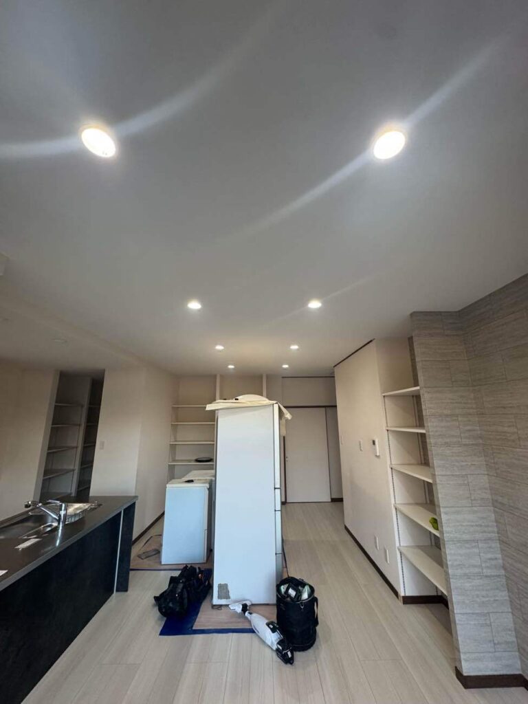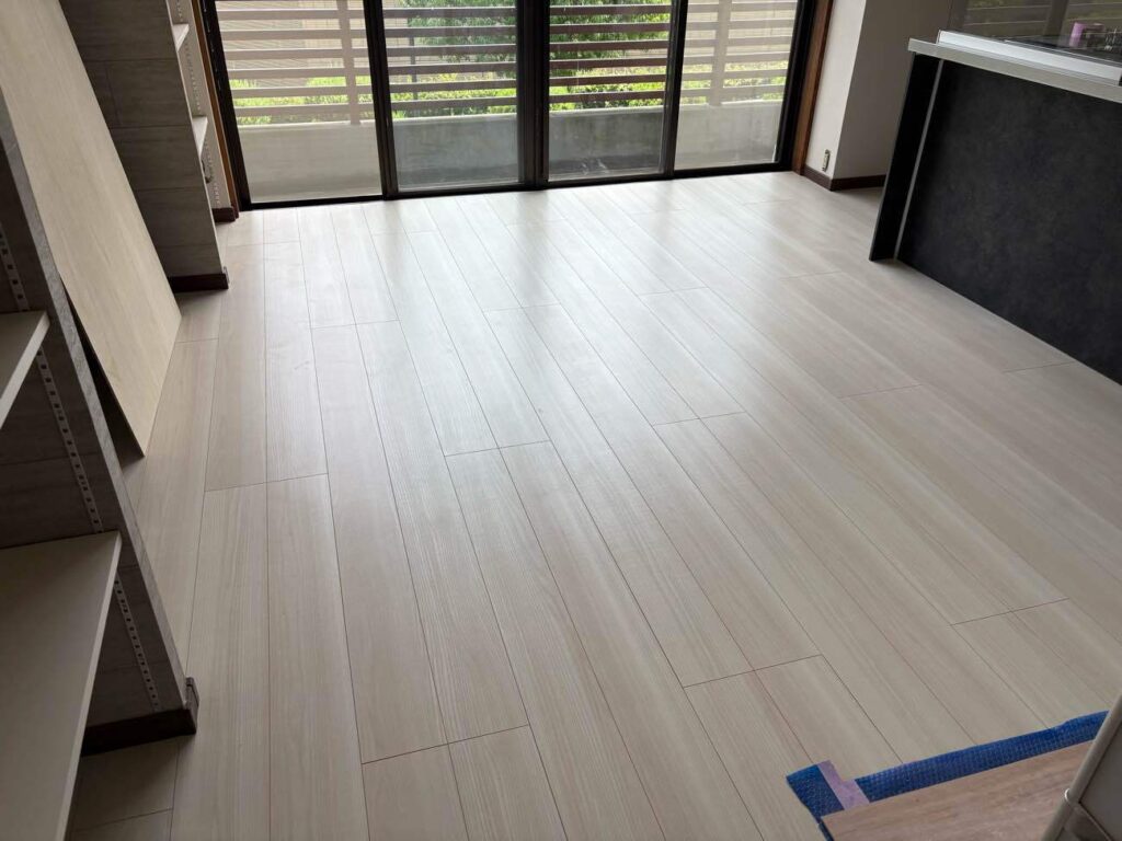 キッチン背面のトクラス「Bb」カップボードや、傷に強く美しいイクタのフローリング、さらにサンゲツの高品質なクロスを組み合わせ、空間全体を上質に刷新しています 。